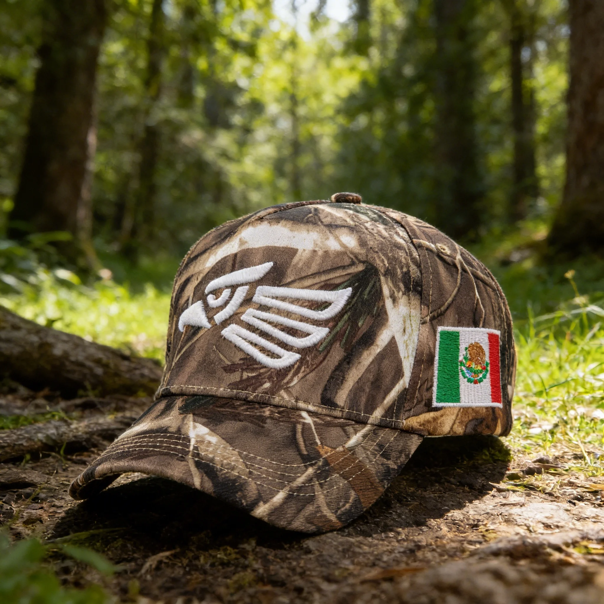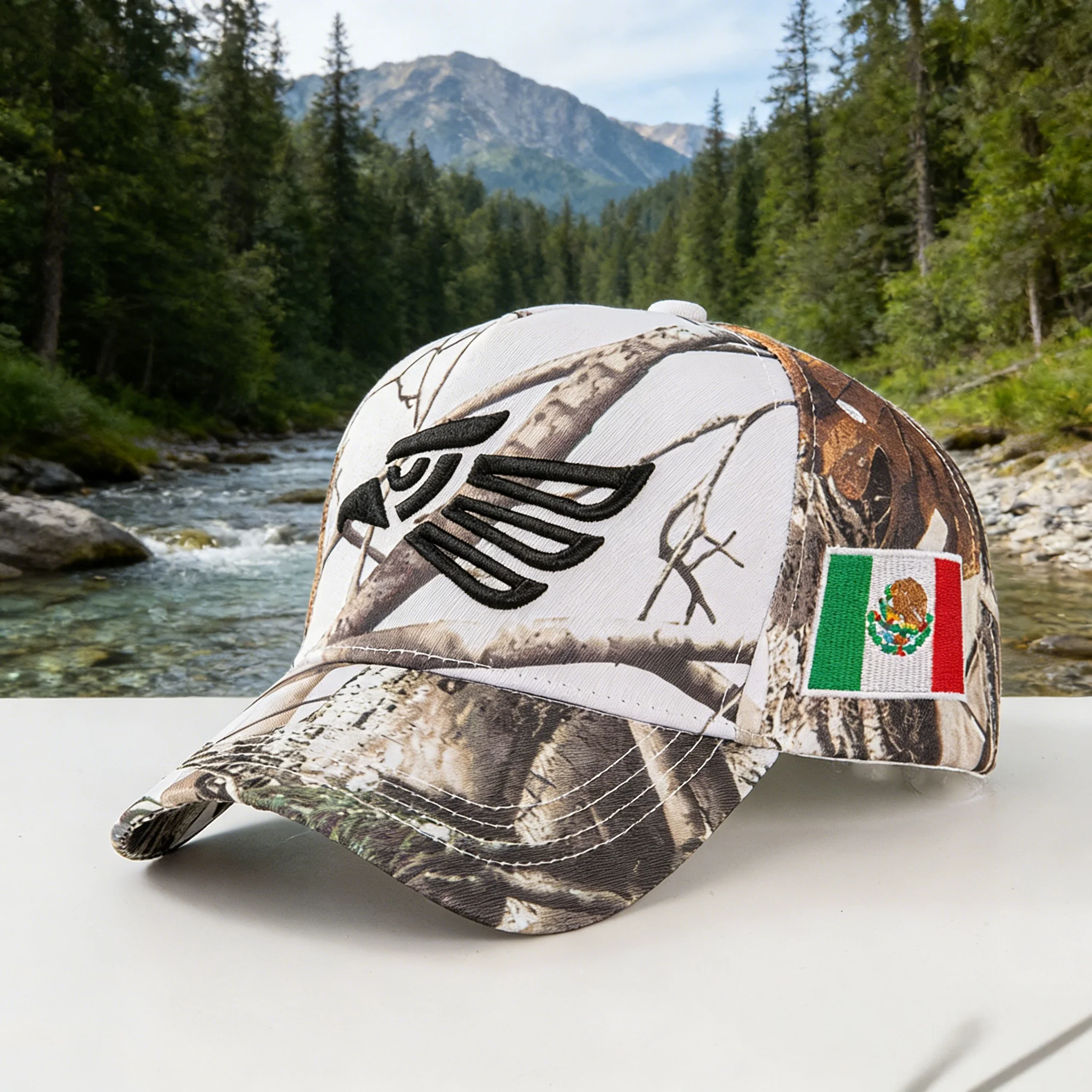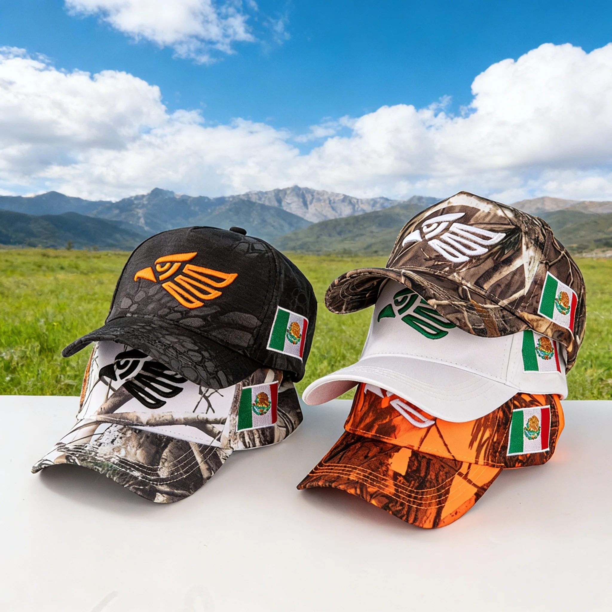 Camouflage baseball caps with eagle embroidery and Mexican flag patches - the perfect outdoor adventure, blending nature-inspire