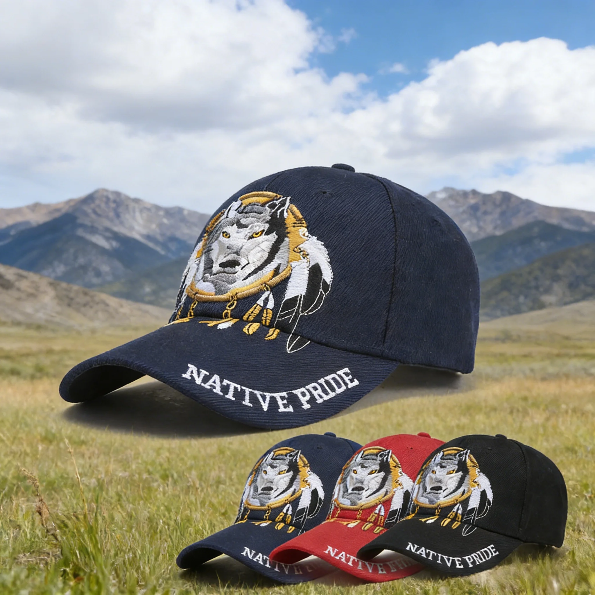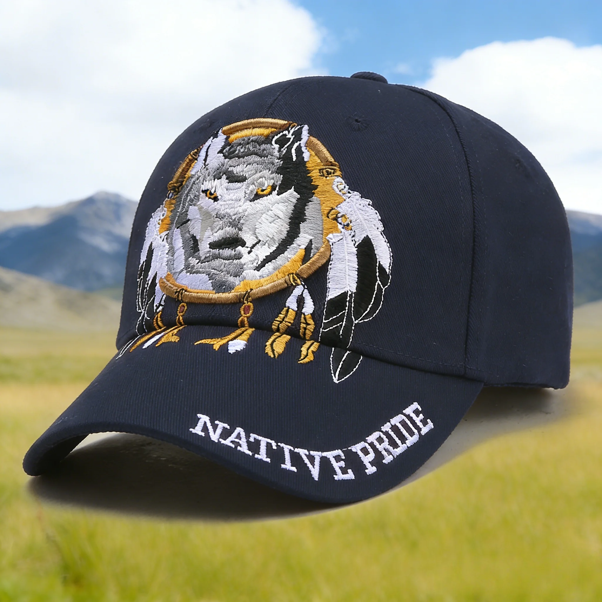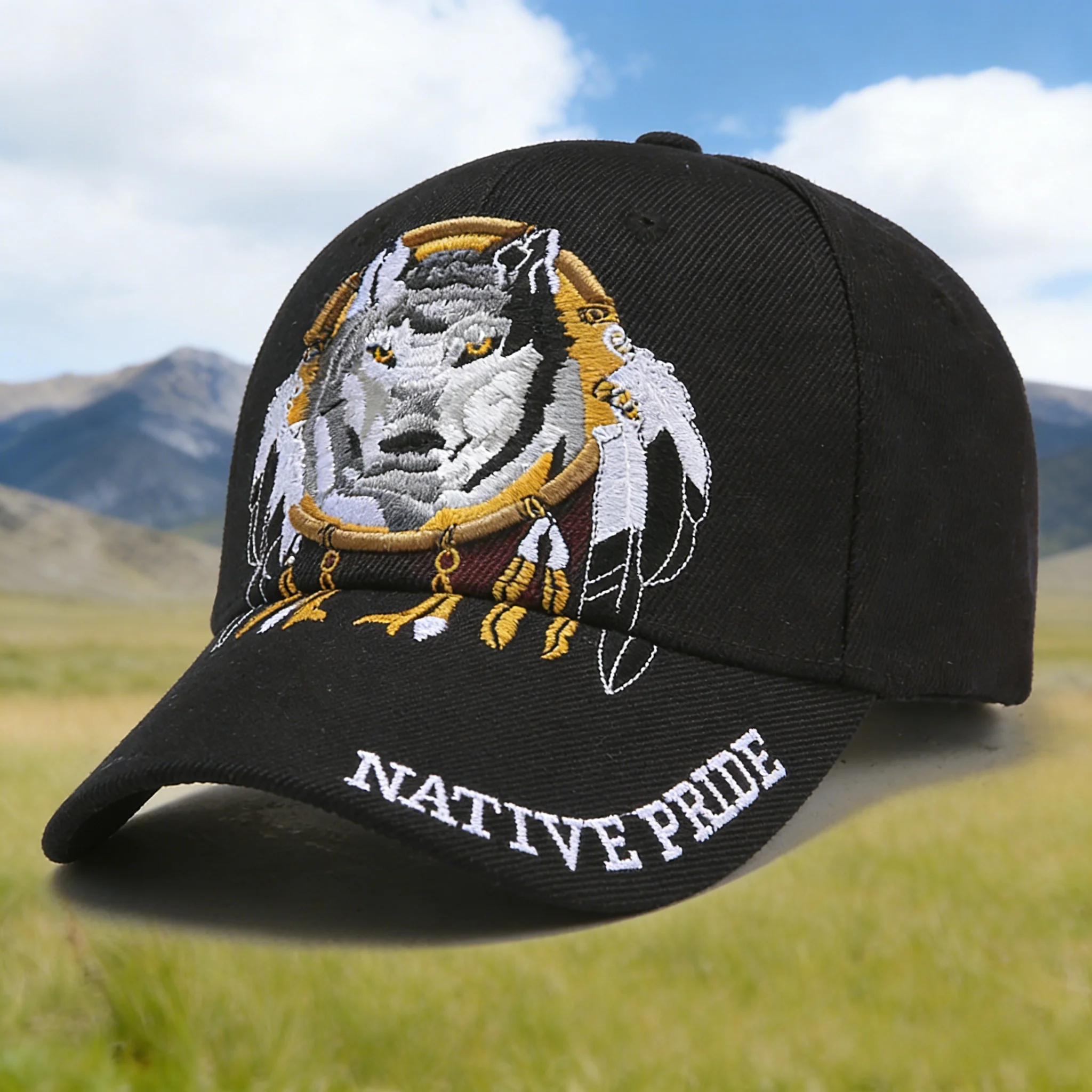 Stylish Baseball Cap with Native Pride Wolf Embroidery, Eye - catching Design, Perfect for Outdoor Adventures, Cultural Inspired